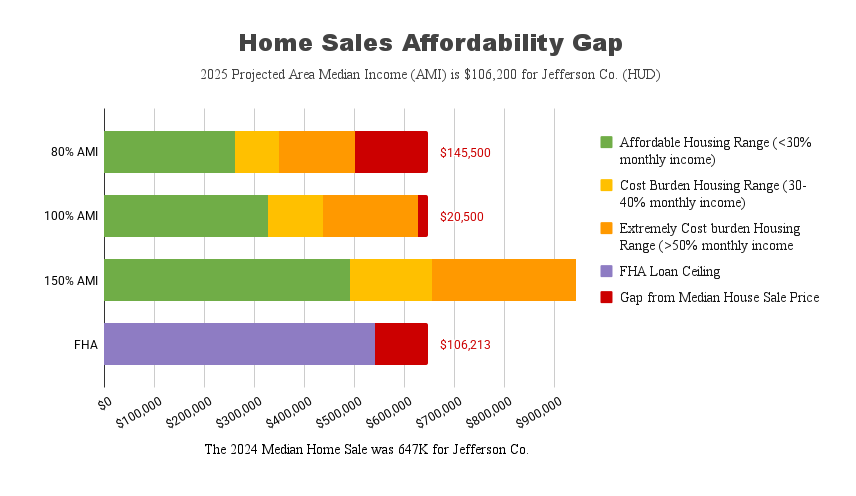 In Jefferson County, where the median home price exceeds $650,000, a household typically needs to earn well over 200% of AMI to purchase a home on the open market. This gap has left many working households with no viable path to stable housing.
